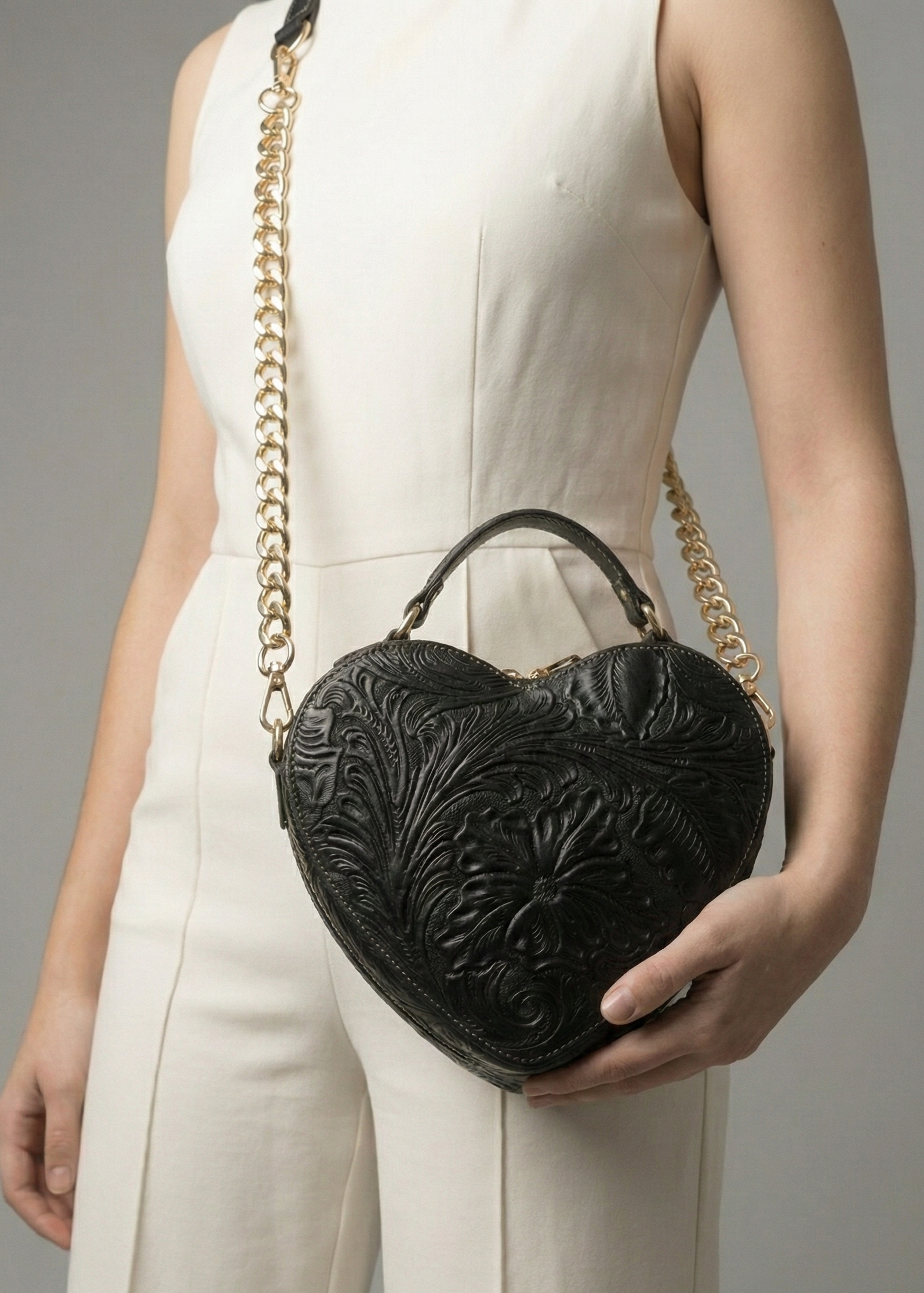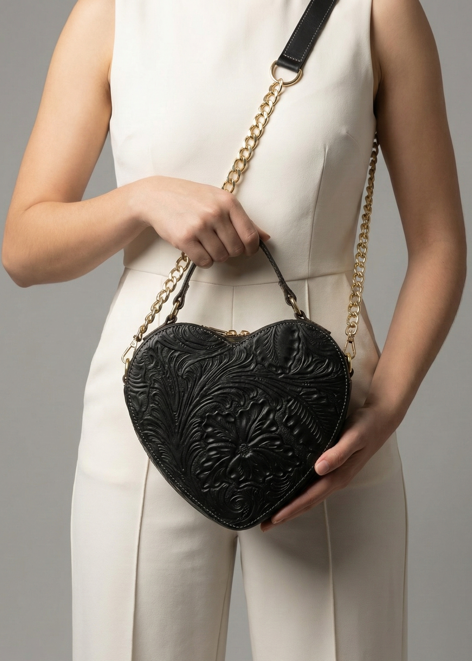 Agrega un toque único a tu outfit con esta bolsa de piel genuina en forma de corazón 100% Mexicana, grabado en relieve inspirado en la artesanía tradicional