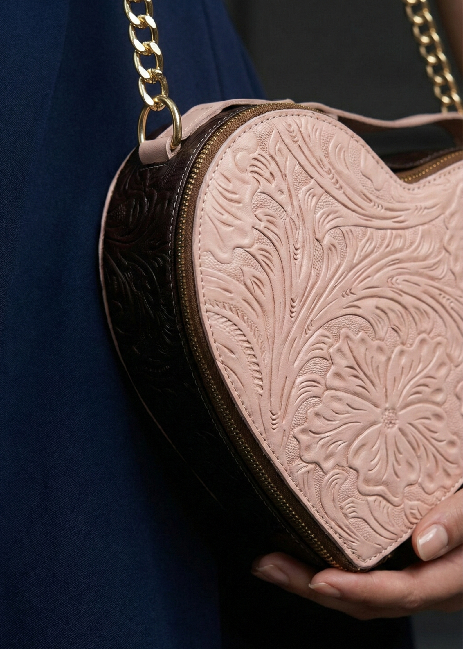 Agrega un toque único a tu outfit con esta bolsa de piel genuina en forma de corazón 100% Mexicana, grabado en relieve inspirado en la artesanía tradicional