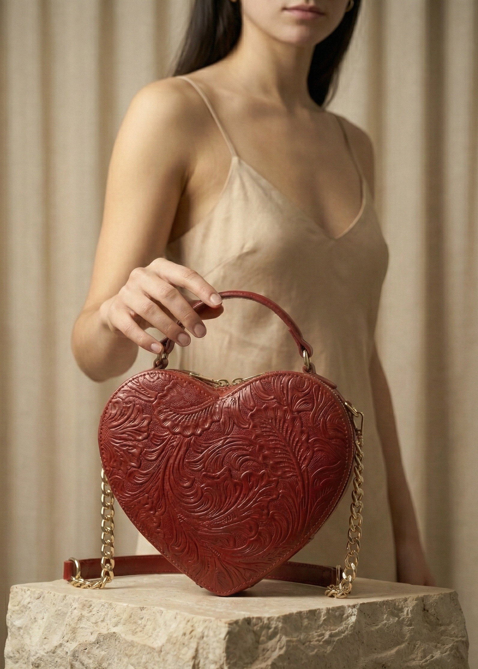 Agrega un toque único a tu outfit con esta bolsa de piel genuina en forma de corazón 100% Mexicana, grabado en relieve inspirado en la artesanía tradicional